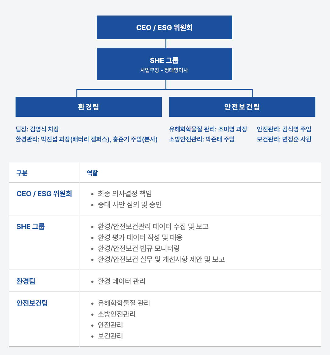 주요 환경 이슈 및 관련 활동은 SHE 그룹장의 책임하에 검토되며, 최종 의사결정은 대표이사와 ESG 위원회의 책임 하에 이루어집니다. 이러한 구조를 통해 당사는 지속가능한 경영을 위한 투명하고 체계적인 의사결정 체계를 유지하고 있습니다.