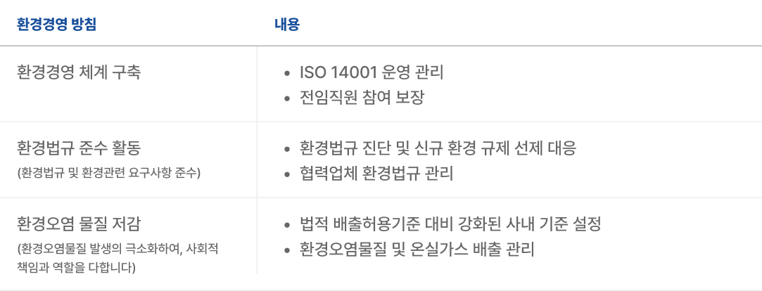 환경 영향을 최소화하기 위한 전략으로, 전문성을 갖춘 협력업체를 선별하여 설비의 최적화를 추진하고 있으며, 동시에 친환경 기술을 단계적으로 도입하고 있습니다. 이를 통해 환경 성과 개선과 동시에 지속가능한 운영 기반을 강화하고 있습니다.