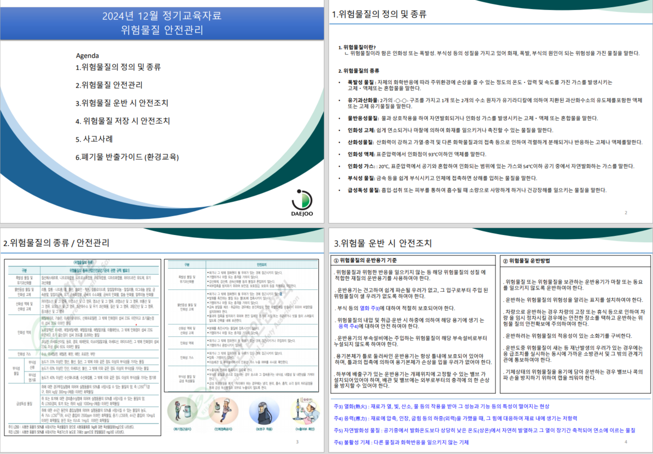 대주전자재료는 환경 사고 및 환경 법규 위반을 사전에 예방하기 위해, 본사와 배터리캠퍼스 전 임직원을 대상으로 정기적인 환경 교육을 실시하고 있습니다. 특히, 기계 및 설비의 정비·보수 작업 시 발생할 수 있는 위험요소에 대한 안전 교육과 실제 환경 법규 위반 사례를 바탕으로 한 예방 중심의 교육을 병행하여 다음과 같이 진행하고 있습니다. 또한, 다양한 부서의 실무자가 함께 참여할 수 있도록 유도하고 있습니다.