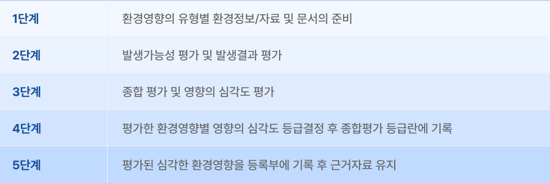 정기 영향평가 외에도, 6개의 기준 사항(법률 및 그 밖의 요건의 제/개정, 건물의 증축 및 개축, 신제품 개발, 설비의 변경, 이해관계자의 요구, 기타 필요하다고 판단 시)이 발생할 때마다 신규 평가를 진행하고 있습니다.