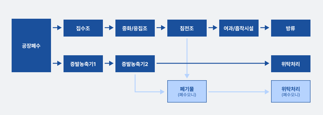 대주전자재료는 폐수 처리 공정을 통해 부정적인 환경 영향을 최소화하고 있습니다. 사내 공정에서 발생되는 폐수는 집수조를 거처 중화/응집조에서 pH 조절제, 고분자 응집제를 투입하여 슬러지를 형성합니다. 침전조에서 슬러지와 처리수를 분리한 뒤 여화/흡착시설에서 추가처리 된 후 법적 기준에 맞춰 방류됩니다. 침전된 슬러지는 필터프레스를 사용하여 Cake 형태로 가공하여 폐기물로 처리됩니다. 일부 공정폐수는 증발농축기를 사용하여 폐수오니와 처리수를 분리하여 처리수는 전문 수처리업체에 위탁하고, 폐수오니는 폐기물로 처리됩니다.