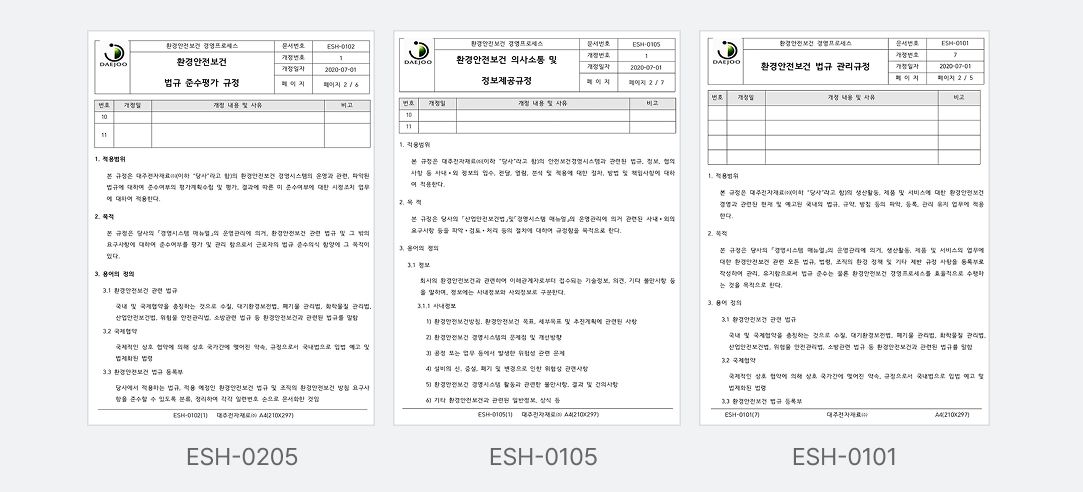 *ESH-0102 : 환경안전보건 법규 준수평가 규정 / ESH-0105 : 환경안전보건 의사소통 및 정보제공 규정 / ESH-0101 : 경영검토 관리규정