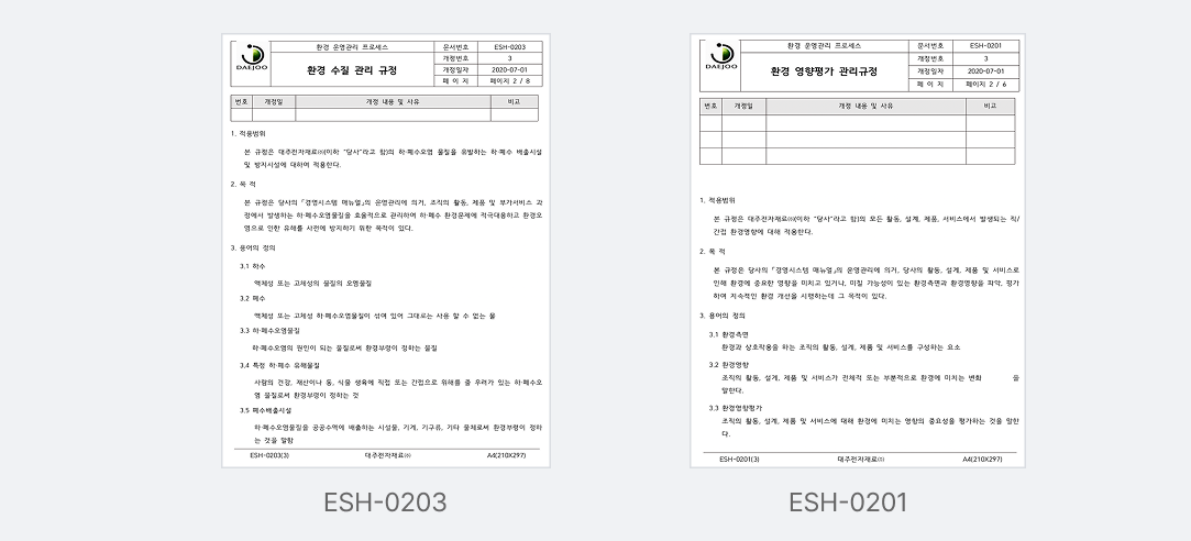 대주전자재료는 사내규정(*ESH-0102)에 따라 연 1회 법규 개정사항을 검토하여 방류수 수질기준의 변경점을 확인합니다. 또한, 내부 및 외부 환경 관련 이슈사항(ESH-0105)과 환경영향평가 자료를 바탕으로 연 1회 경영검토(*QEP-0101)를 진행하여 개선점을 도출하고 새로운 경영목표를 설정합니다.