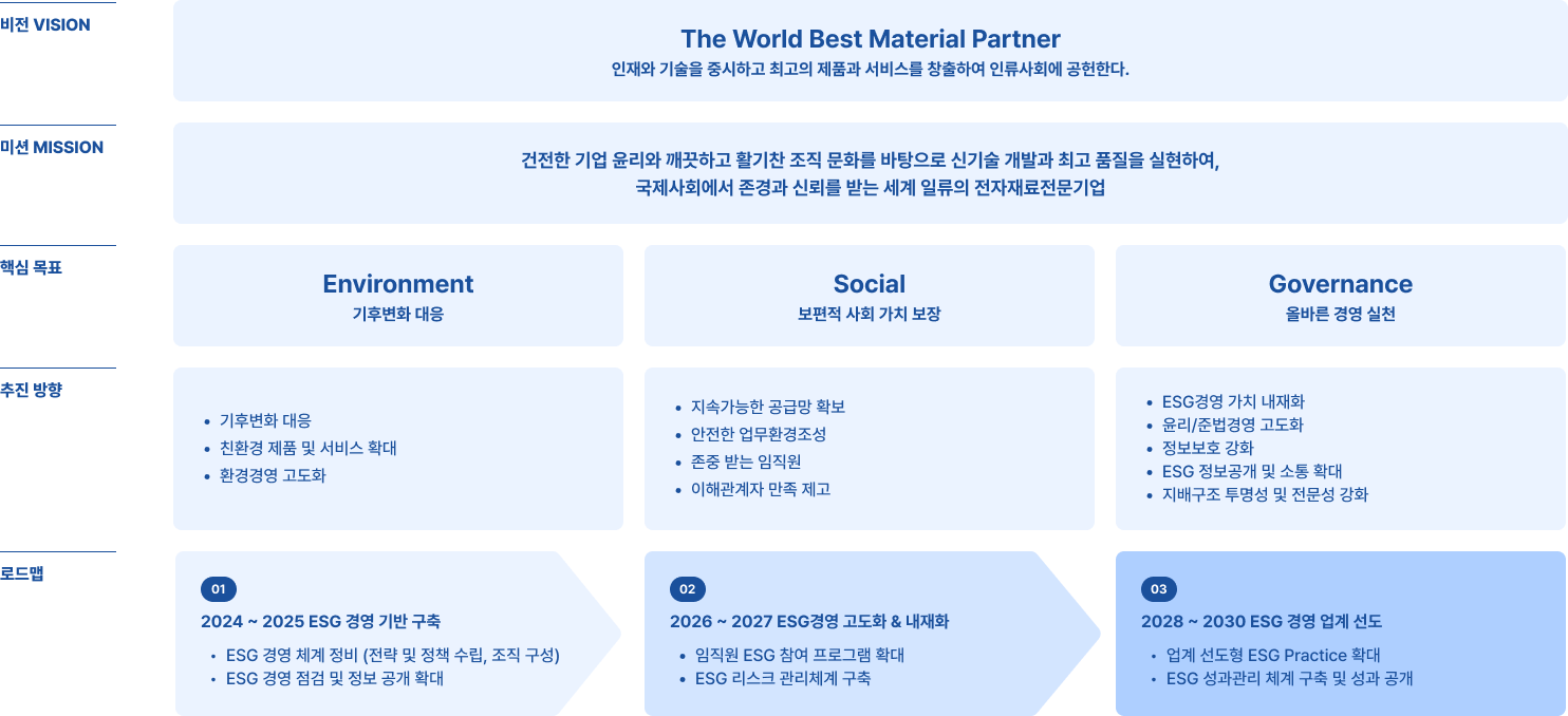 대주전자재료는 건전한 기업 윤리와 깨끗하고 활기찬 조직 문화를 바탕으로 신기술 개발과 최고 품질을 실현하여, 국제사회에서 존경과 신뢰를 받는 세계 일류의 전자재료전문기업을 추구합니다. 대주전자재료는 ESG 경영을 통해 환경 보호, 사회적 책임, 그리고 투명한 지배구조를 실현합니다. 이차전지 음극재 및 전자재료 산업에서 지속 가능한 성장을 이끌고, 순환 경제와 친환경 에너지 솔루션을 통해 인류 사회에 긍정적인 변화를 이끌어 나갑니다.
