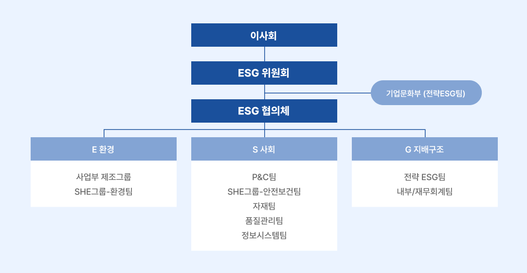 대주전자재료는 ESG 위원회와 ESG 협의체를 두어 ESG 경영 활동을 전사적으로 추진하고 있습니다. ESG위원회를 포함한 대주전자재료 이사회와 최고 경영진은 주요 ESG 안건을 보고받고 정책, 전략, 목표에 대한 최종 책임을 갖고 있으며, 실무 조직인 전략·ESG팀 주도하에 본사 사업부 및 지원부서 담당자들과 유기적으로 협업해 ESG 경영 활동을 이행합니다.