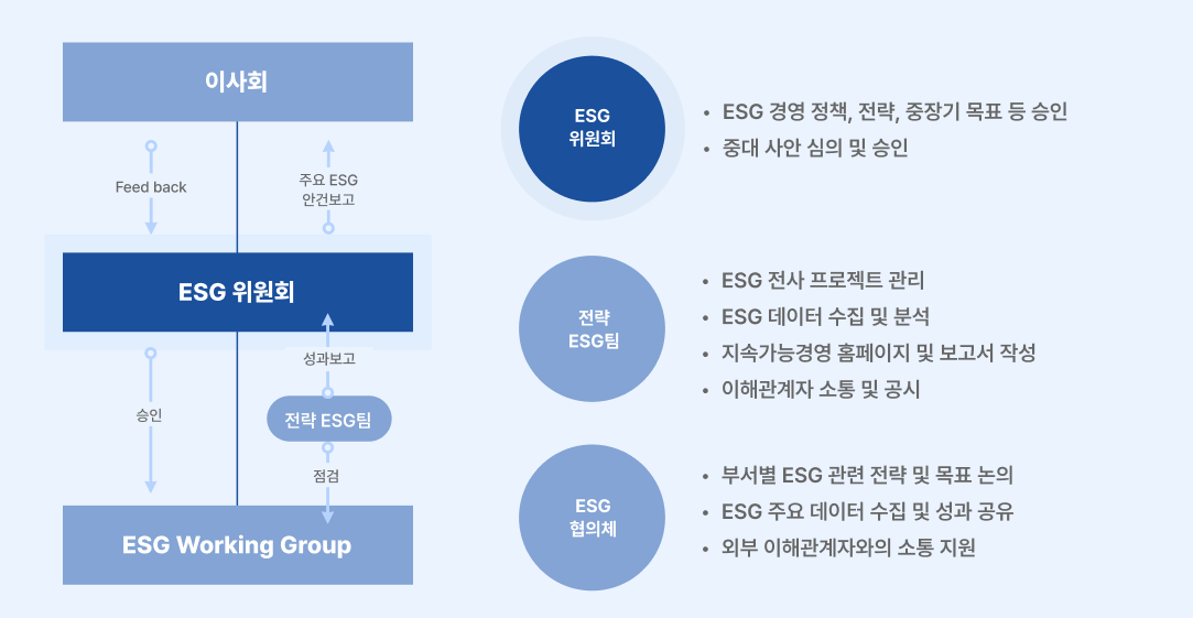 전략 · ESG팀은 ESG 전사 프로젝트 관리, ESG 데이터 수집 및 분석, 지속가능경영 홈페이지 및 보고서 작성, 이해관계자 소통 및 공시 등 전사 차원의 ESG 경영 관련 기획·관리·협력하는 역할을 수행하고 있습니다. ESG 경영체계를 고도화하기 위해 전사 ESG 데이터 시스템을 구축하여 관리 지표를 설계하고 지표별 데이터를 관리하고 있습니다.