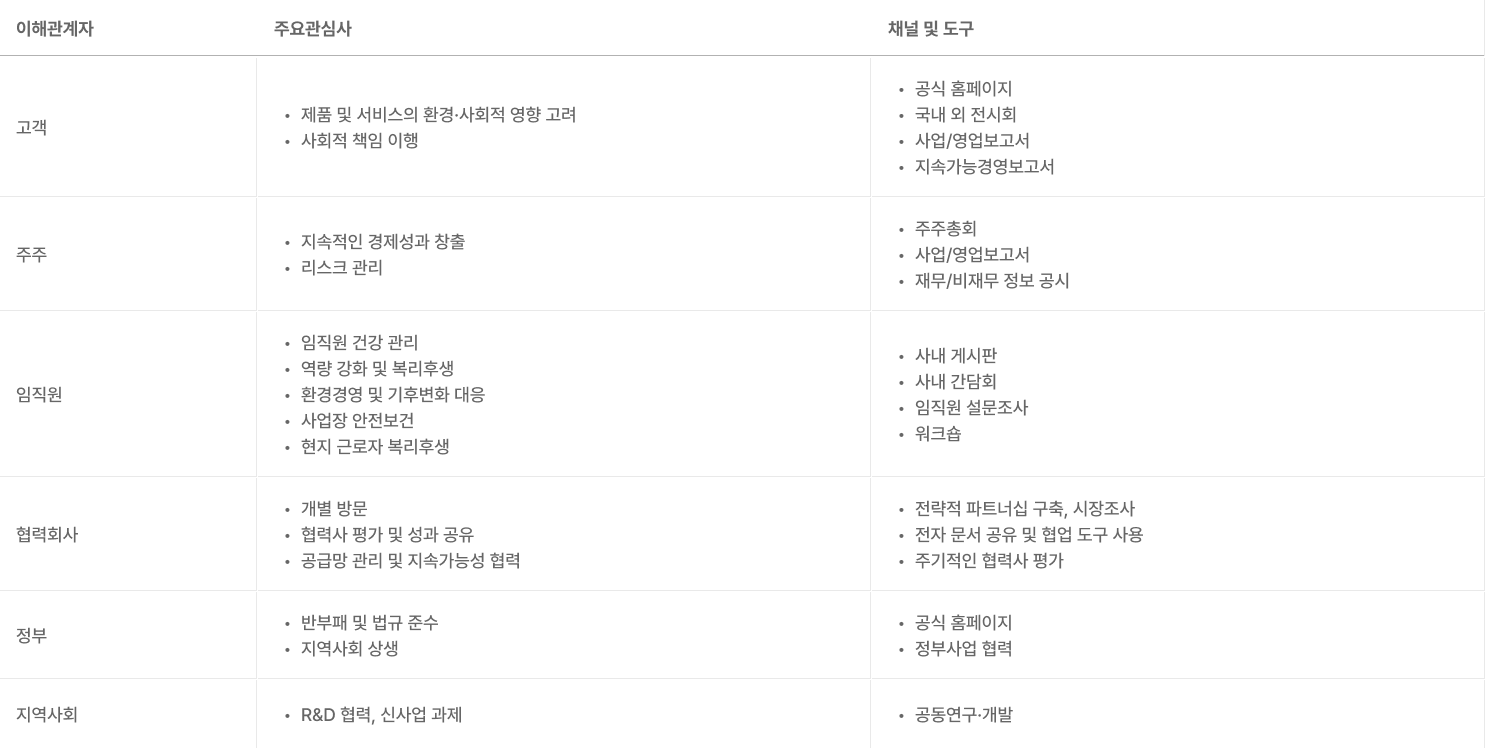 대주전자재료는 주요 이해관계자 그룹을 분류하여 각 그룹별 소통채널을 통해 수시로 이해관계자와 경영활동 및 관련 이슈를 공유하고 있습니다. 대주전자재료의 주요 환경, 사회, 거버넌스, 경제 성과를 공유함과 동시에 장기적인 방향성도 함께 고민합니다. 소통채널을 통해 파악한 다양한 이해관계자의 의견은 적극적으로 수렴하여 경영활동에도 반영하고 있습니다.