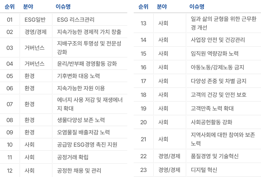 2024년 6월 4일부터 6월 14일까지 총 11일간, 임직원과 외부 이해관계자를 대상으로 이중 중대성 설문조사를 진행하였습니다. 총 78명이 참여한 이번 설문은 온라인 방식으로 이루어졌으며, 재무적 중대성(Financial Materiality)과 사회·환경적 중대성(Impact Materiality) 관점에서 각 이슈에 대한 영향성을 평가했습니다. 이를 통해 23개의 주요 이슈에 대한 우선순위를 식별하였습니다.