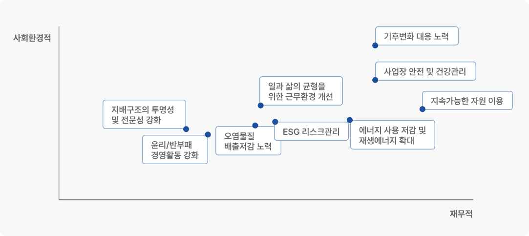 재무적 중대성 분석을 위해 먼저 ESG 평가기관 및 주요 고객사의 요구사항을 면밀히 검토하였습니다. 이어서 산업 내 유사 기업을 대상으로 벤치마킹을 실시하여 주요 이슈와 대응 방안을 파악하였습니다. 동시에 당사의 내부 경영 현황을 종합적으로 분석하고, 주요 이해관계자를 대상으로 설문조사를 진행함으로써 재무적 관점에서의 중요 이슈를 도출하고자 하였습니다.