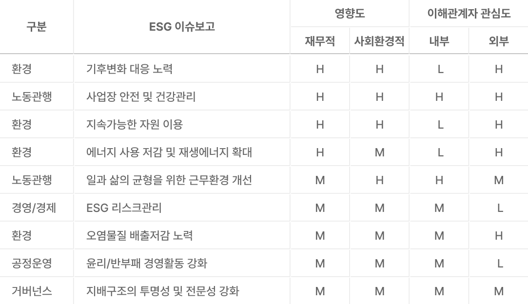 사회‧환경적 중대성 이슈를 도출하기 위해 글로벌 ESG 관련 주요 표준을 분석하고, 산업 및 사회 전반에 대한 미디어 보도를 심층적으로 검토하였습니다. 또한 주요 이해관계자를 대상으로 설문조사를 실시하여, 사회적 기대와 환경적 책임에 대한 다양한 의견을 수렴하였습니다.