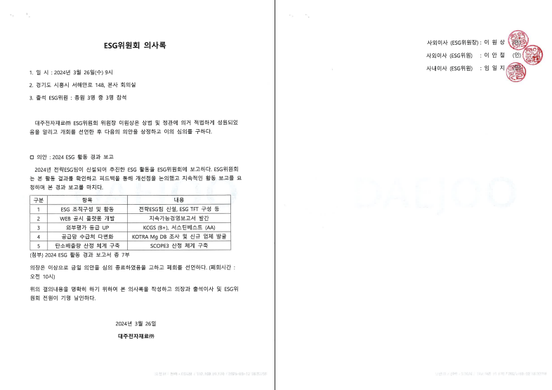 대주전자재료는 감사위원회의 업무 역량 제고를 위해 인덕회계법인 공인회계사가 진행하는 교육을 수료하였습니다. 2024년 11월 25일 감사위원 전원이 참석하였습니다.