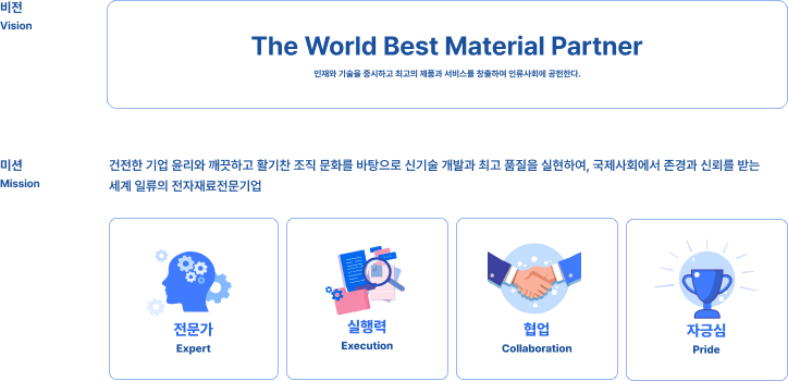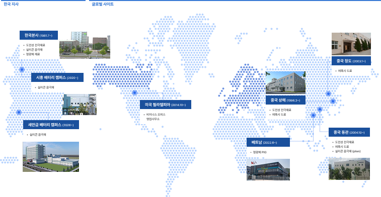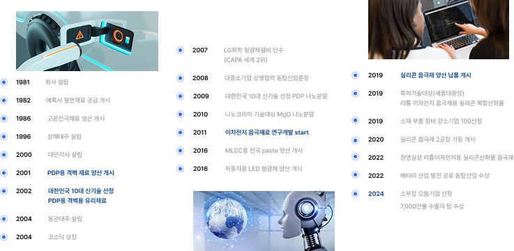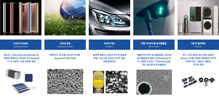백색가전용 절연재료, 전극재료 등의 소재 생산을 시작으로 끊임없는 미래 기술에 대한 R&D 투자를 통해 질적 성장과 전략기술의 심화 발전을 도모해지금은 이차전지용 실리콘 음극재, 자동차용 LED 형광체 소재, 자동차용 MLCC 전도성 페이스트 등의 제품을 통하여 차세대 자동차용 핵심 부품 소재업체로 거듭나고 있습니다.