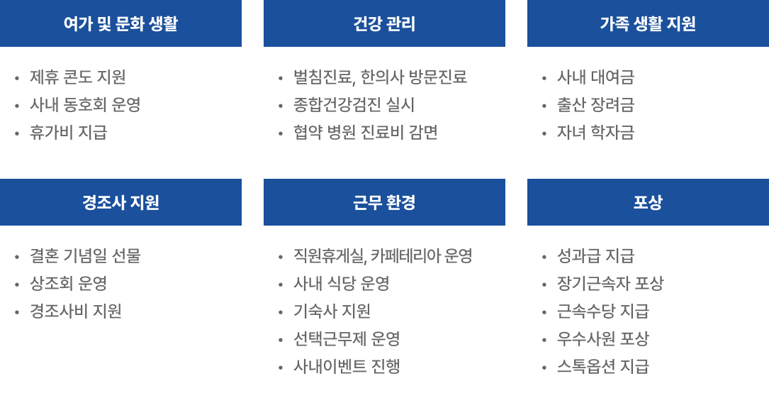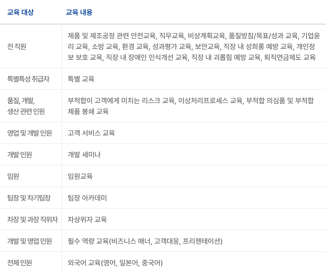임직원을 대상으로 리더십, 커뮤니케이션, 조직문화 등 온라인 교육을 지원하고 있습니다. 사내 교육을 통해 임직원의 전문성과 직무 만족도를 높이고 조직의 목표 달성에 기여할 수 있도록 지원하고 있습니다. 지속적인 학습 문화를 조성하여 직원의 업무 효율성을 증대시키는데 기여합니다. 또한, 희망하는 지원자에 한하여 외국어 교육을 실시하고 있습니다. 글로벌 기업에 걸맞는 개인의 역량을 갖출 수 있도록 교육 기회를 제공하고 지원자 니즈에 맞는 교육 커리큘럼을 운영하고 있습니다.