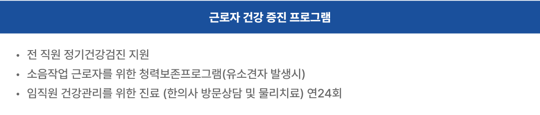 대주전자재료는 임직원의 개인 질병과 업무상 질환을 예방하고자 정기적으로 건강검진을 실시합니다. 또한, 근로자의 의료 서비스 이용도를 촉진하기 위해 다양한 프로그램을 운영하고 있습니다. 2023년도 건강증진활동으로는 시흥시 정왕보건지소의 의사와 간호사가 방문하여 자기주도 건강체크를 실시하고, 금연 프로그램 및 걷기 프로그램을 진행하였습니다. 근로자들의 참여를 장려하기 위해 프로그램 참여 시 선물 및 격려금을 제공했습니다.