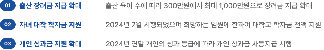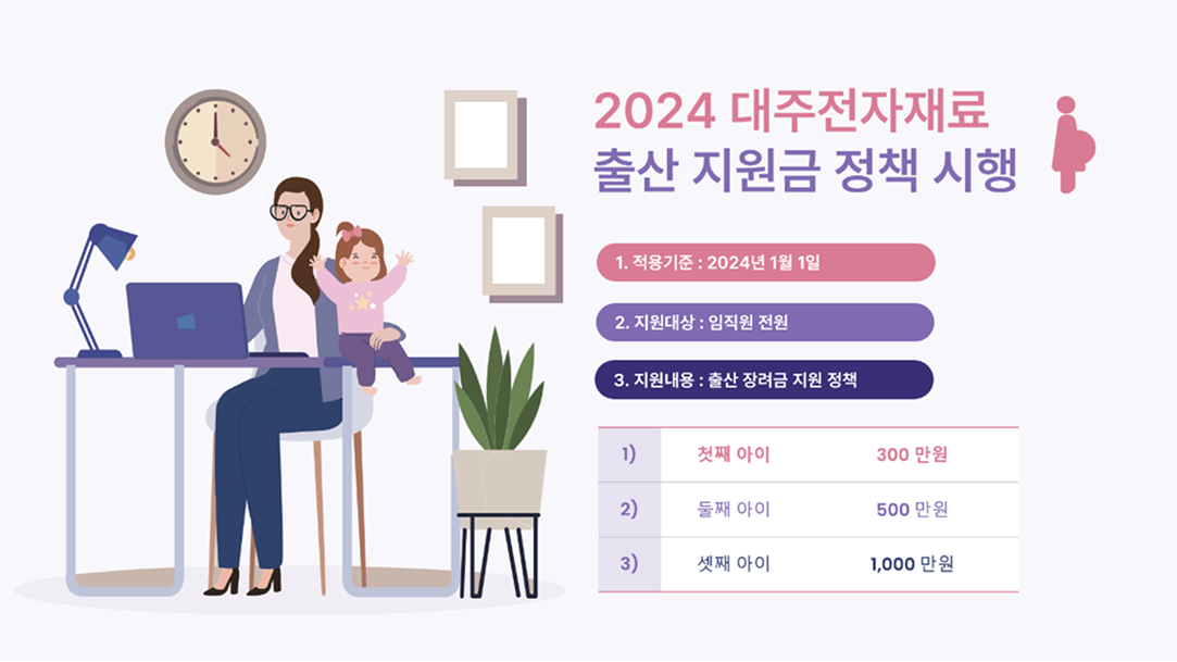 대주전자재료는 임직원의 출산과 육아를 지원하기 위해 다양한 제도를 운영하고 있습니다. 2024년 1월 1일부터 시행되는 출산 지원금 정책은 모든 임직원을 대상으로 하며, 첫째 아이 출산 시 300만 원, 둘째 아이는 500만 원, 셋째 아이는 1,000만 원의 지원금을 제공합니다. 이러한 지원 제도는 임직원의 육아 부담을 덜어주고, 일과 가정의 균형을 유지할 수 있도록 돕기 위한 노력의 일환입니다. 대주전자재료는 앞으로도 출산과 육아를 적극적으로 지원하며, 가족 친화적인 근무 환경을 조성해 나갈 계획입니다.