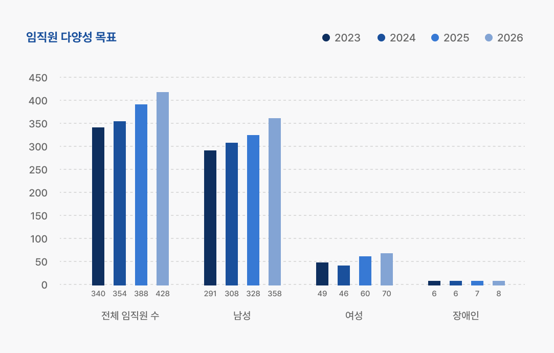 대주전자재료는 2025년부터 2027년까지의 직원 구성원 비율 향상 계획을 통해 직원들의 다양성을 점진적으로 확대하는 것을 목표로 하고 있습니다. 균형 잡힌 성별 구성을 이루는 것을 목표로, 여성 직원의 비율을 꾸준히 증가시켜 2027년까지 70명으로 확대할 계획입니다. 대주전자재료는 목표를 달성하기 위해 지속적으로 다양한 인재를 유치하고, 이들의 성장을 지원하는 환경을 조성하여 모든 직원이 공정하게 기여할 수 있는 문화를 만들어 나갈 것입니다.