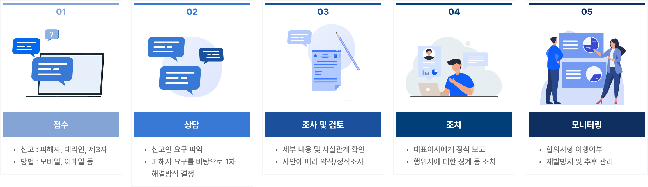 대주전자재료는 고충 신고 프로세스에서 상담 내용과 제보자의 신분을 철저히 비밀로 보장합니다. 고충 접수 후에는 신고인의 요구사항을 파악하여 1차 해결 방식을 결정하고, 조사와 검토를 통해 사실 관계를 확인합니다. 이후 대표이사에게 정식으로 보고하며, 사실 여부에 따라 적절한 징계 및 인사 조치를 취합니다. 또한, 사후 피해 방지를 위해 종결 이후 합의사항 이행 여부를 철저히 확인하고, 재발 방지와 추후 관리를 지속적으로 실시하고 있습니다.