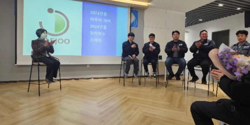 CEO와 구성원이 자유롭게 의견을 나누는 소통 시간을 갖습니다. 구성원이 질문하면 대표가 답을 하는 형식으로 직원의 애로사항이나 새로운 제안 등을 함께 고민하고 풀어가는 성격의 미팅입니다. 회사 대표와 구성원 간의 자유로운 소통 방법으로 회사와 개인 간의 격차를 줄이고 소통하는 기업문화를 만들어 갑니다.