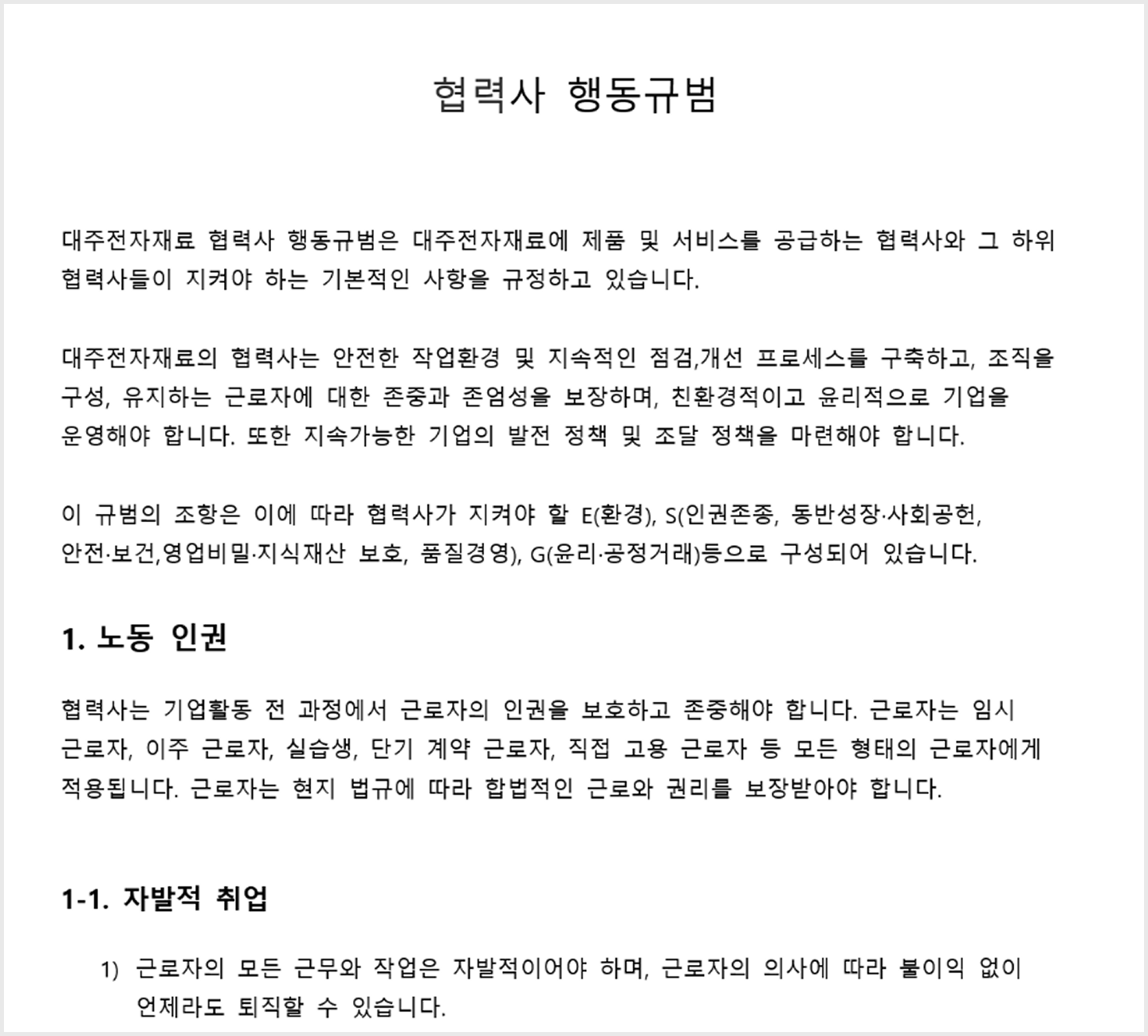 대주전자재료의 협력사는 안전한 작업환경을 구축하고, 근로자의 존중과 존엄성을 보장하며, 환경친화적이고 윤리적인 기업 운영을 실천해야 합니다. 이를 위해 대주전자재료는 협력사 행동규범을 수립하여 협력사가 준수해야 할 기준을 명확히 제시하고 있습니다. 이 규범은 환경(E), 인권존중·동반성장·안전보건·품질경영(S), 윤리·공정거래(G) 등으로 구성되어 있으며, 모든 협력사가 지속 가능한 경영을 실현할 수 있도록 지침 역할을 합니다. 대주전자재료는 행동규범을 통해 협력사와 함께 책임 있는 공급망을 구축하고 장기적인 상생과 발전을 도모하고자 합니다.