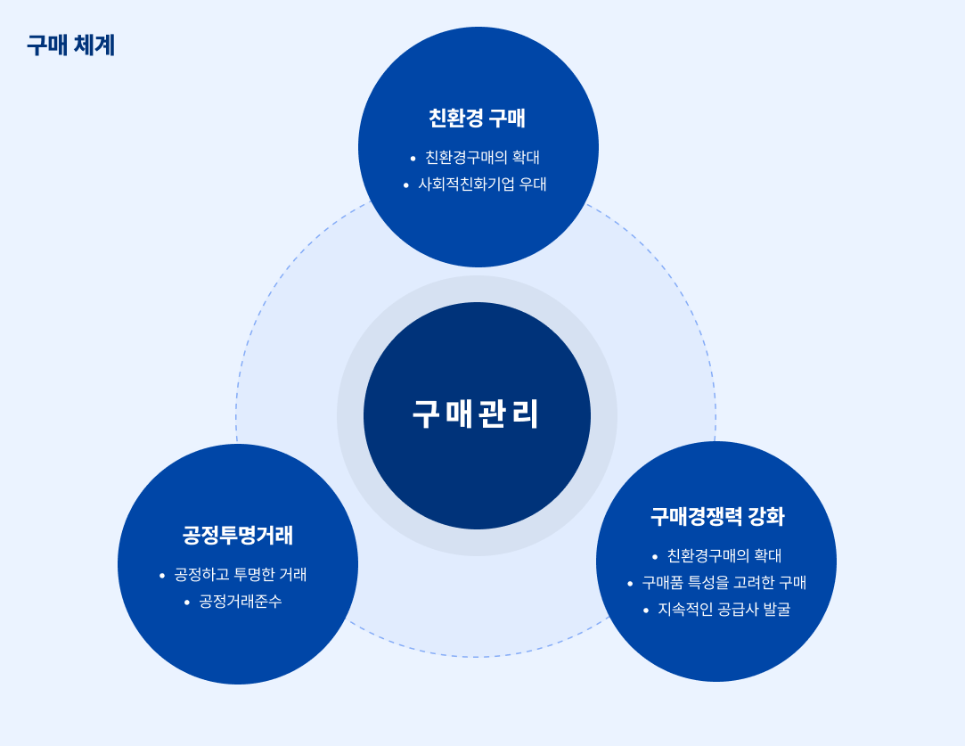 대주전자재료의 구매 체계는 친환경구매, 공정·투명거래, 구매경쟁력 강화를 중심으로 운영되고 있습니다. 먼저 친환경구매를 통해 환경 보호와 사회적 책임을 다하는 기업을 우대하며 지속적으로 친환경 구매를 확대해 나가고 있습니다. 또한 모든 거래에서 공정성과 투명성을 유지하여 신뢰받는 거래 환경을 조성하고 있습니다. 마지막으로 최적의 가치를 제공하는 구매를 실현하기 위해 구매 품목의 특성을 고려한 전략적 구매와 지속 가능한 공급사 발굴을 추진하여 구매경쟁력을 강화하고 있습니다. 이러한 구매 체계를 통해 대주전자재료는 윤리적이고 책임 있는 공급망 관리를 지속적으로 강화해 나가고 있습니다.