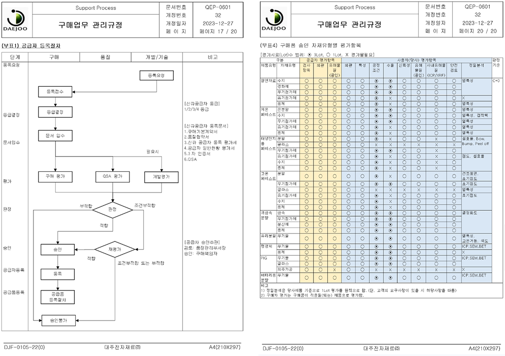 대주전자재료는 공정하고 투명한 거래처 관리를 위해 명확한 기준과 절차에 따라 신규 거래처를 신중히 선정하고 있습니다. 공급자 등록절차는 먼저 내부심사를 통해 협력사의 자격을 평가한 후 승인을 거쳐 최종 등록됩니다. 이 과정에서 협력사의 신뢰성을 확보하기 위해 사내 감사와 검토를 통해 협력사의 경쟁력을 강화하고 잠재적인 리스크를 최소화하고자 합니다. 또한 구매품 승인 자재유형별 평가항목을 적용하여 각 자재 유형에 맞는 평가 기준을 세밀히 점검하며 정기적인 평가를 통해 협력사와의 지속 가능한 성장을 도모합니다. 이를 통해 대주전자재료는 협력사와 함께 상호 발전을 목표로 투명하고 신뢰할 수 있는 거래 환경을 구축해 나가고 있습니다.