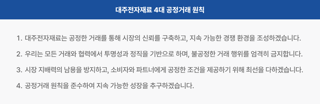 대주전자재료는 공정하고 투명한 거래를 위해 4대 공정거래 원칙을 철저히 준수하며, 이를 통해 시장의 신뢰를 구축하고 지속 가능한 성장을 도모하고자 합니다. 앞으로도 공정거래 원칙을 바탕으로 공정한 경쟁 환경을 조성하고, 모든 거래에서 투명성과 정직을 유지하며, 공정거래 문화를 더욱 강화해 나가겠습니다.